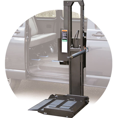 Swing Series lifts are revolving wheelchair lifts that can handle tight parking spaces. The deployed platform does not protrude further from the side of the vehicle than the fully open front door, giving the user the ability to park close to buildings or narrow sidewalks. The telescopic platform extends to allow the wheelchair to be driven onto it parallel to the vehicle.